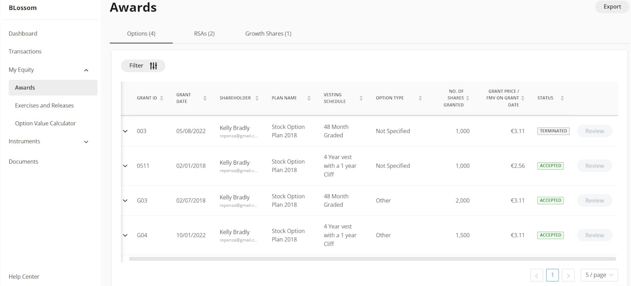 You can find all the details about your Options, Restricted Stock, Growth Shares or Stock Appreciation Rights (SAR's, cash awards) in the My Equity tab, in the Awards screen.
