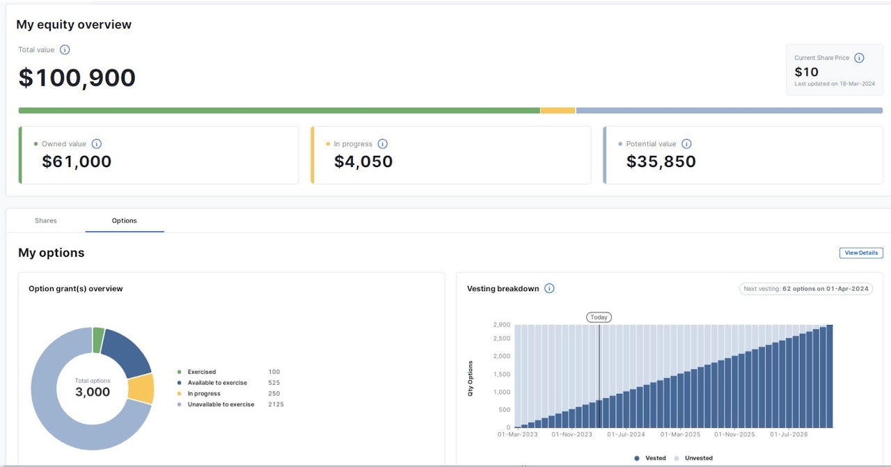 The options dashboard provides an overview of your option grants and will be displayed to you if you have an option grant regardless as to the status of that grant.