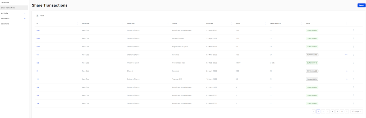 The Transactions tab gives you a detailed history of any shares that were issued to you. The Source column refers to the origin of shares. Shares may originate from: